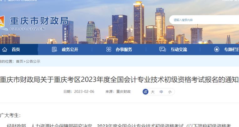 重庆市财政局关于重庆考区2023年度全国会计专业技术初级资格考试报名缴费有关事宜的通知