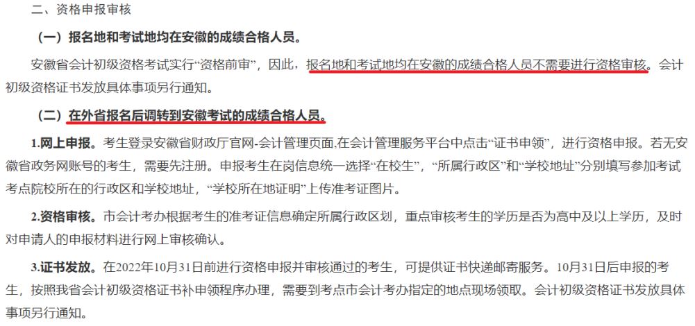 安徽省会计初级资格考试实行“资格前审”,因此,报名地和考试地均在安徽的成绩合格人员不需要进行资格审核。会计初级资格证书发放具体事项另行通知。