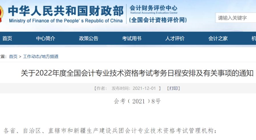 | 2022年 | 全国会计资格评价网 | 2021年12月1日 | 2022年1月5日至1月24日 |