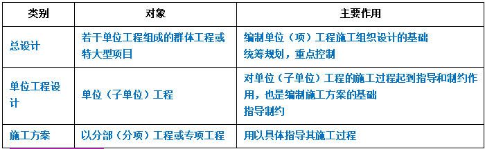 施工组织设计按编制对象一般分为施工组织总设计、单位工程施工组织设计和施工方案3类。