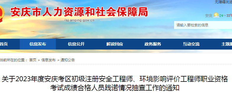 8月7日,安庆市人力资源和社会保障局发布了《关于2023年度安庆考区初级注册安全工程师、环境影响评价工程师职业资格考试成绩合格人员践诺情况抽查工作的通知》,凡是被随机抽查的考生,请于8月14日前将审核材料发送至指定邮箱。