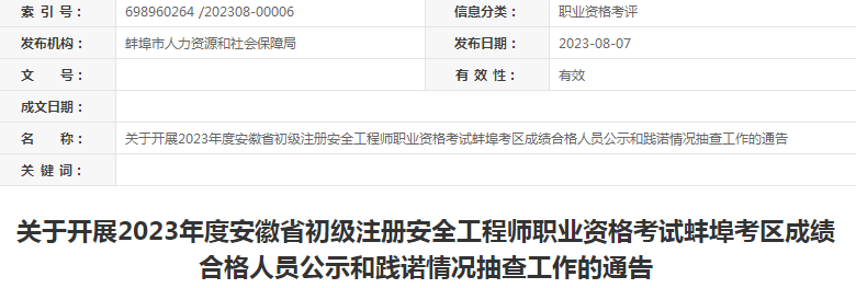 8月7日,蚌埠市人力资源和社会保障局发布了《关于开展2023年度安徽省初级注册安全工程师职业资格考试蚌埠考区成绩合格人员公示和践诺情况抽查工作的通告》,提到考试成绩公示期为2023年8月8日至2023年8月17日,抽查对象核查材料上传日期8月11日。