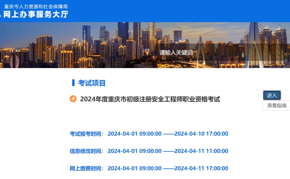 2024年重庆市初级注册安全工程师报名入口官网今日已开通,报名时间:4月1日9:00至4月10日17:00,网上缴费时间:4月1日9:00至4月11日17:00。