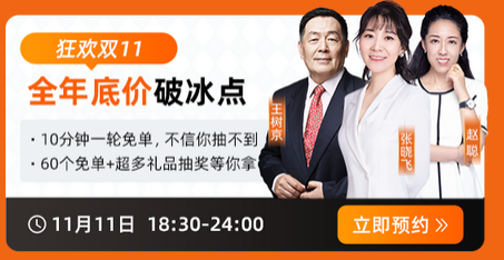 双11活动震撼开启,今晚18:30环球网校直播间60个免单名额,111个直播随单礼物,先到先得。终极免单夜,全年底价破冰点,这波优惠不容错过。