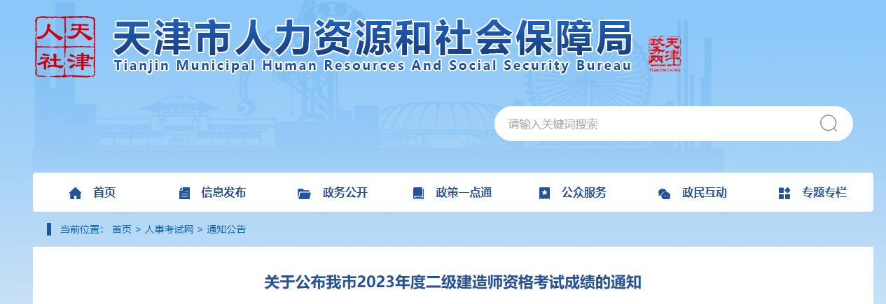 2023年8月4日,天津市人力资源和社会保障局官网发布了关于2023天津市二级建造师考试成绩查询的通知,考生需登录天津市人力资源和社会保障局网站天津人事考试版块首页左侧“二级建造师、二级造价师考试”栏目查询成绩。