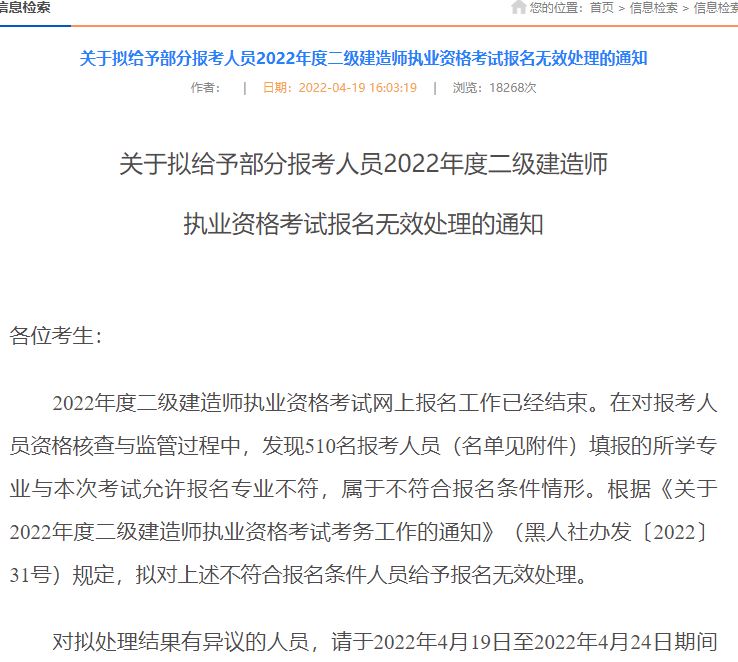 2022年4月19日,黑龙江省人事考试网发布《关于拟给予部分报考人员2022年度二级建造师执业资格考试报名无效处理的通知》,建议黑龙江省的二建考生查看该通知,在报名时,注意查看报考条件,避免出现此类错误。