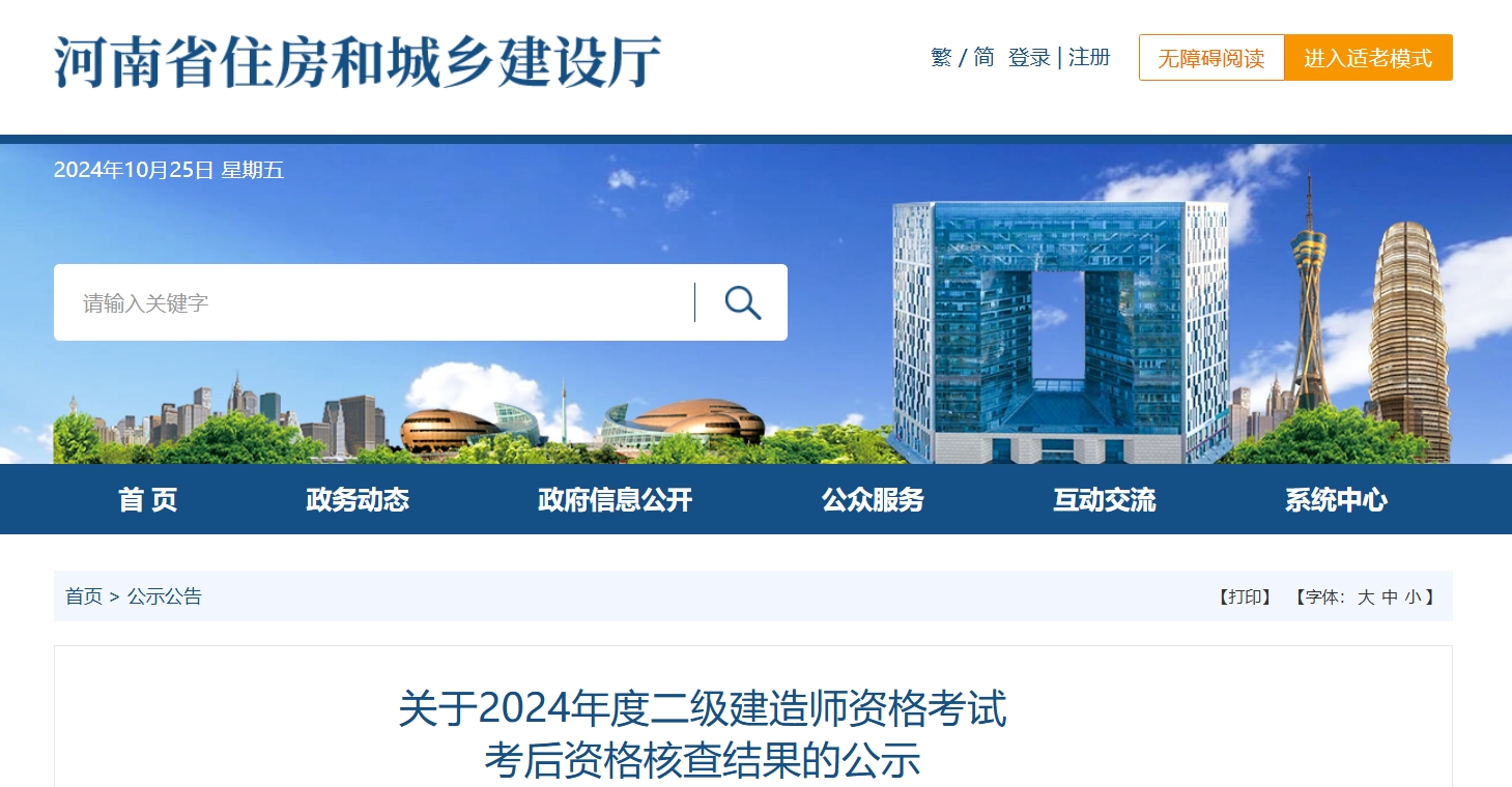 近日,河南省住房和城乡建设厅发布《关于2024年度二级建造师资格考试考后资格核查结果的公示》,2024年河南二级建造师考试成绩合格人员考后资格核查已结束,公示期为10月25日-10月31日。
