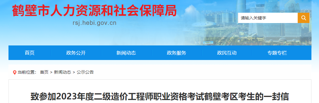 11月6日,鹤壁市人力资源和社会保障局发布了“致参加2023年度二级造价工程师职业资格考试鹤壁考区考生的一封信”,请考生提前查看了解考点、考场分布。
