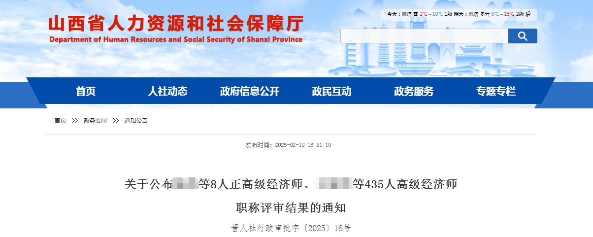 附件:陈X等8人正高级经济师、于丽X等435人高级经济师职称名单(附件详见:https://rst.shanxi.gov.cn/zwyw/tzgg/202502/t20250219_9771620.shtml)