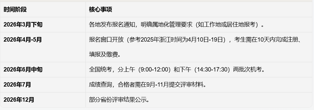 根据2025年浙江省报名规律及人社部通知,2026年报名时间预计为4月上旬至5月上旬,具体以浙江省人事考试网公告为准。以下为关键节点梳理: