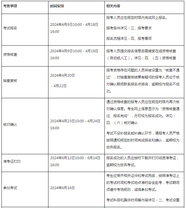 考试机构将于2024年4月20日-4月22日进行报考资格抽查复核,并将抽查复核中发现问题的人员设置为“核查不通过”。所有完成报名确认的考生应于2024年4月23日10:00重新登录报名系统查询核查状态,对人工核查或抽查复核结果有疑问的人员应于核对确认截止前联系报名点咨询,逾期视作报名不成功。