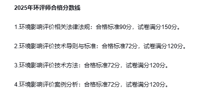 除了成绩滚动周期,我们还得清楚 2025 年环评师考试各科目的合格分数线: