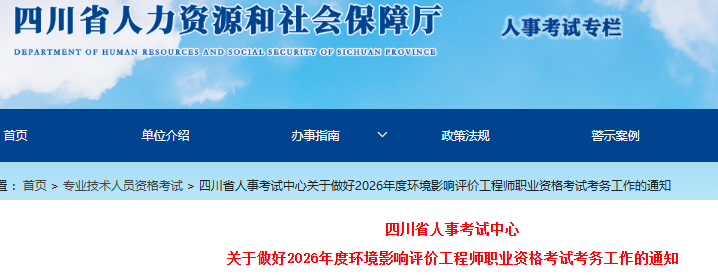 根据人力资源和社会保障部人事考试中心《关于2026年度环境影响评价工程师职业资格考试考务工作的通知》(人考中心函〔2026〕6号)及四川省人力资源和社会保障厅《关于做好我省专业技术人员资格考试告知承诺制有关工作的通知》(川人社办发〔2020〕14号)等文件精神,为切实做好我省2026年度环境影响评价工程师职业资格考试考务工作,现将有关事项通知如下: