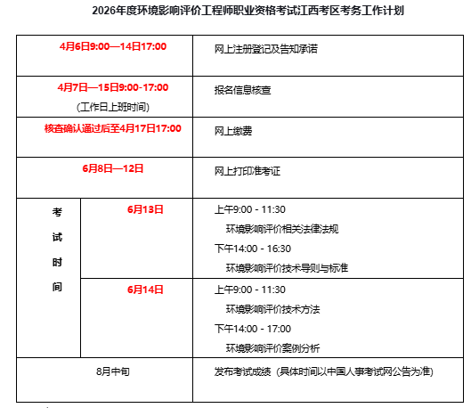 江西人事考试网3月30日发布了《关于做好2026年度环境影响评价工程师职业资格考试江西考区考务工作的通知》,其中明确了2026年江西环境影响评价师报名时间为4月6日9:00—14日17:00;报名信息核查时间为4月7日—15日9:00-17:00(工作日上班时间);网上缴费时间为核查确认通过后至4月17日17:00;网上打印准考证时间为6月8日—12日。