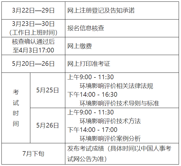 3月19日,根据江西人事考试网发布的《关于做好2024年度环境影响评价工程师职业资格考试江西考区考务工作的通知》,其中明确了2024年江西环境影响评价工程师考试报名时间为3月22日-29日;报名信息核查时间为3月23日-30日;网上缴费截止时间为4月3日17:00;准考证打印时间为5月20日-26日。