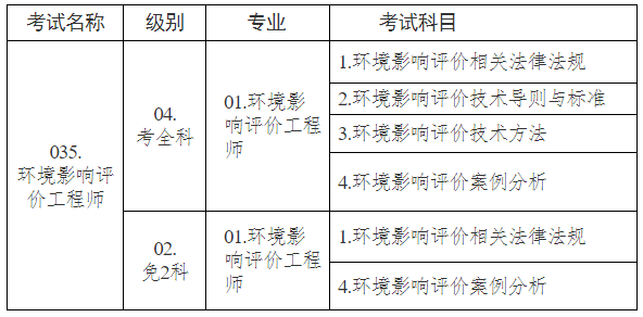 环境影响评价工程师职业资格考试设置“环境影响评价相关法律法规”(客观题)、“环境影响评价技术导则与标准”(客观题)、“环境影响评价技术方法”(客观题)和“环境影响评价案例分析”(主观题)4个科目。参加4个科目考试(级别为考全科)的人员须在连续2个考试年度内通过应试科目,参加2个科目考试(级别为免2科)的人员须在1个考试年度内通过应试科目,方可取得资格证书。