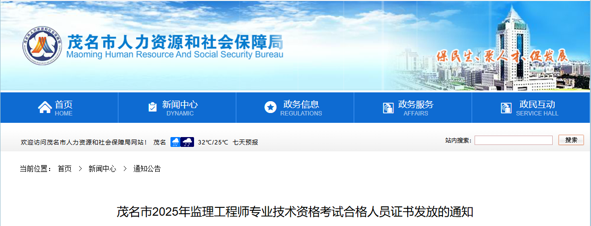 9月1日,茂名市人力资源和社会保障局发布了“茂名市2025年监理工程师专业技术资格考试合格人员证书发放的通知”,明确监理工程师考试合格人员证书定于9月1日起开始发放。