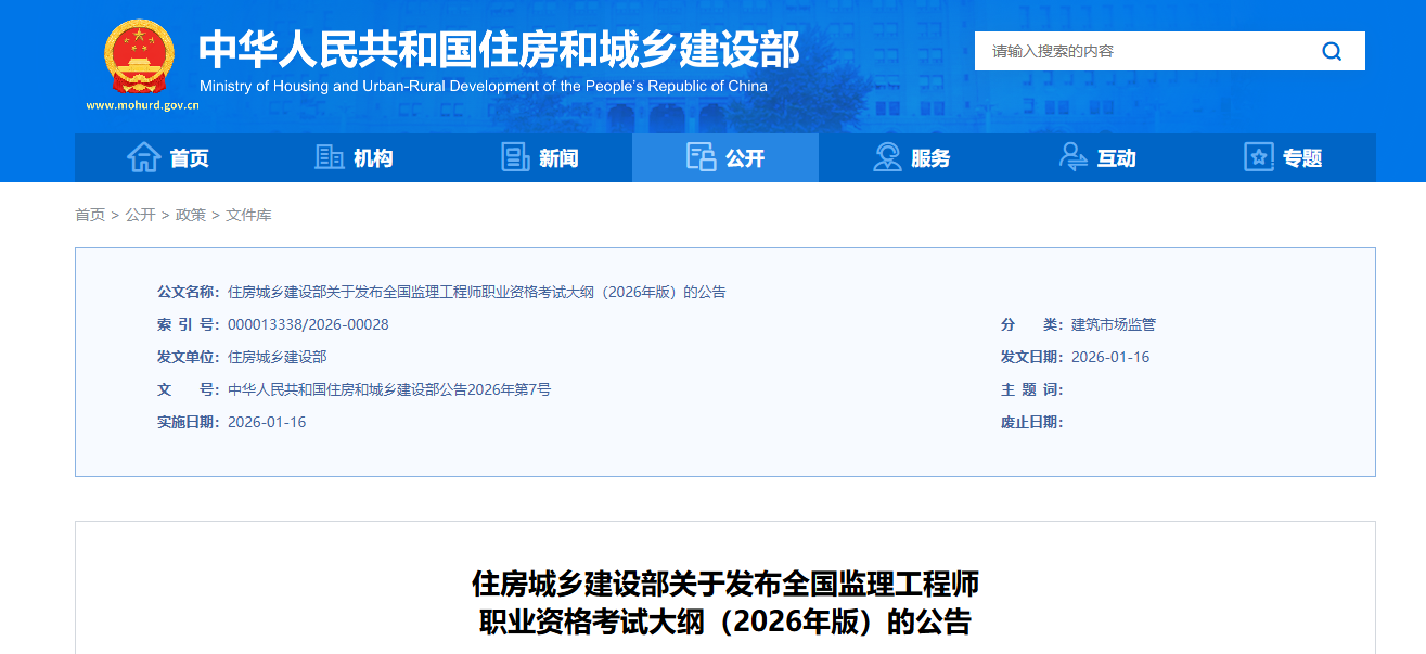 1月19日,住房城乡建设部发布了“关于发布全国监理工程师职业资格考试大纲(2026年版)的公告”,《全国监理工程师职业资格考试大纲》(2026年版)自发布之日起执行。2020年发布的《全国监理工程师职业资格考试大纲》同时废止。