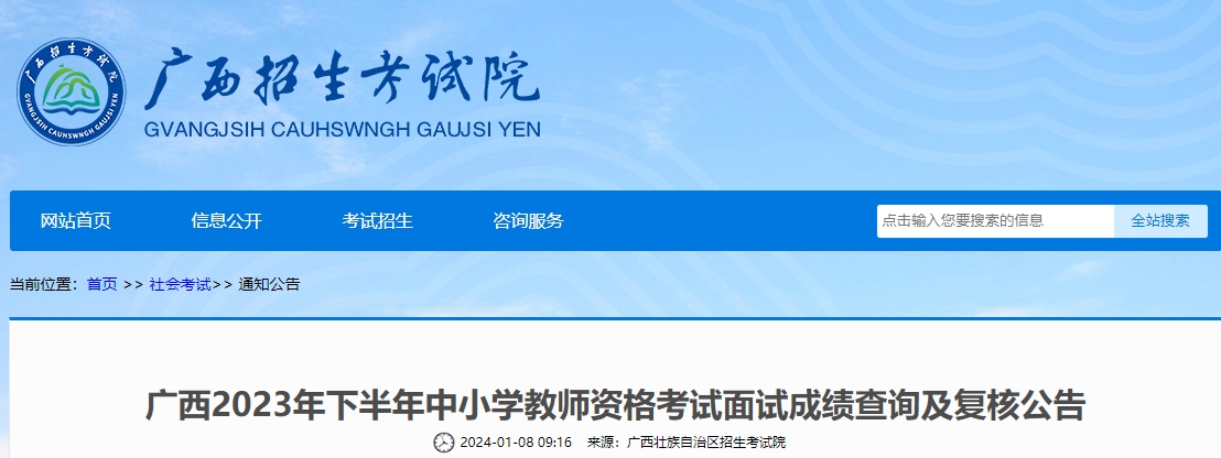 广西2023年下半年中小学教师资格考试面试成绩查询及复核公告