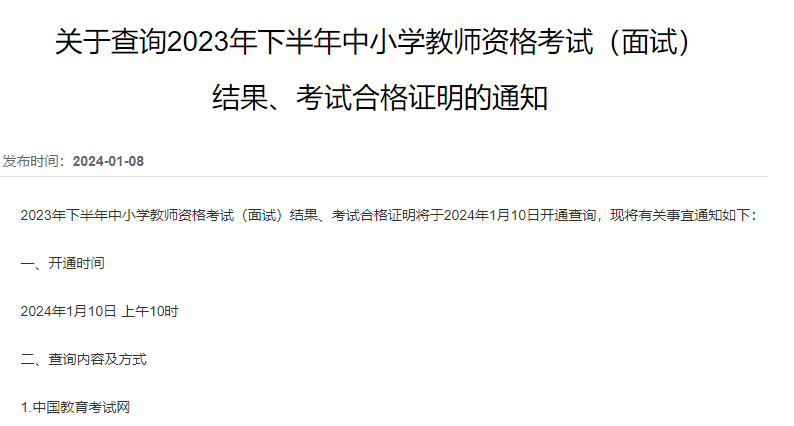2023下半年教师资格面试成绩查询入口为中国教育考试网,2024年1月10日10时起查询2023年下半年教师资格面试成绩,考生需准备好姓名及证件号码信息,才能正确查询考试成绩。