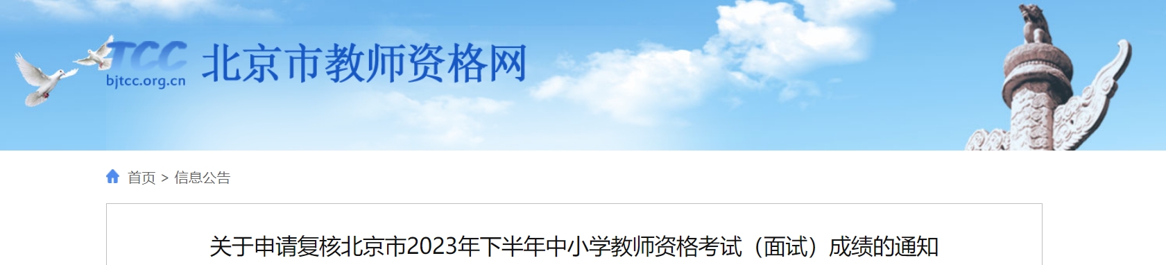 北京市教师资格网近日发布《关于申请复核北京市2023年下半年中小学教师资格考试(面试)成绩的通知》,北京市2023年下半年中小学教师资格考试(面试)成绩于2024年1月10日上午10:00发布,考生如对本人成绩有疑问,可申请成绩复核,申请时间为1月10日上午10:00至1月23日下午4:00。