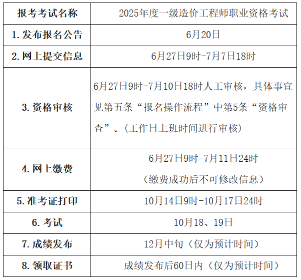 根据《人力资源社会保障部办公厅关于2025年度专业技术人员职业资格考试工作计划及有关事项的通知》(人社厅发〔2025〕1号),2025年度一级造价工程师职业资格考试于10月18日、19日举行。现将有关事项通知如下: