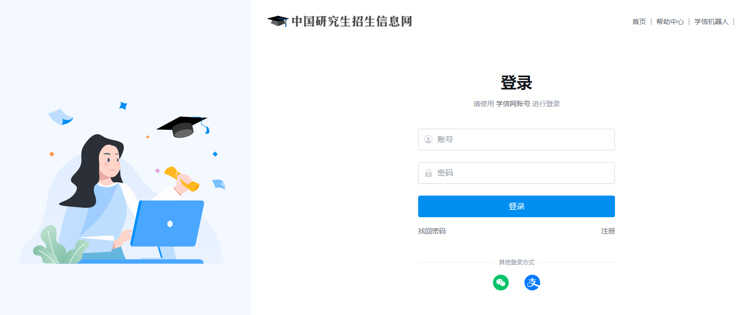 1、登录研招网。考生应在规定时间登录“中国研究生招生信息网”(网址:https://yz.chsi.com.cn)认真阅读2026年全国硕士研究生招生考试报名公告和报名须知,并按省级教育招生考试机构、报考点以及招生单位的网上公告要求进行报名;