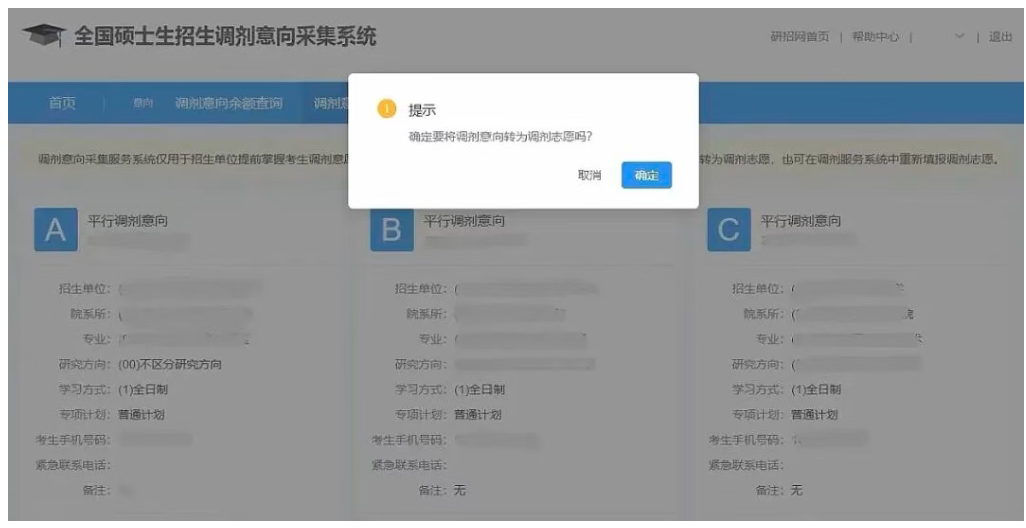 ⑤若符合条件且未超过调剂数量——成功提交调剂意向——4月8日将调剂意向转为调剂志愿——若符合条件且未超过调剂数量——调剂志愿成功填报