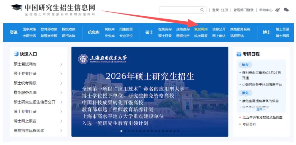 ①登录研招网点击“复试调剂”;