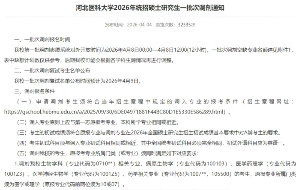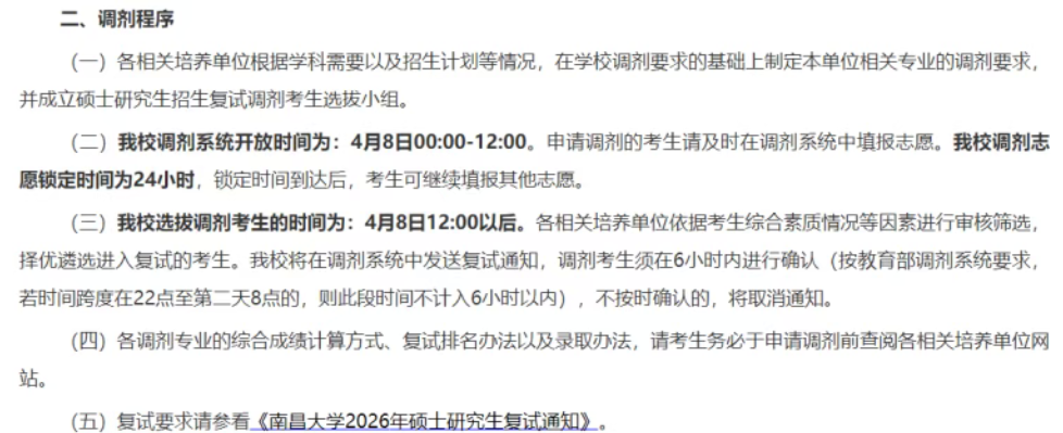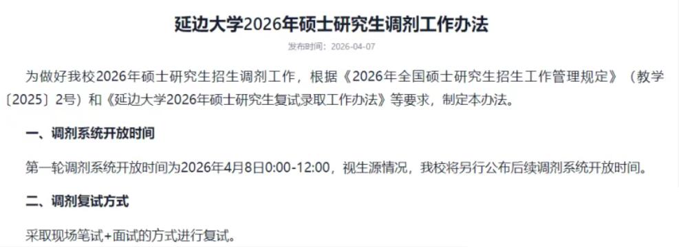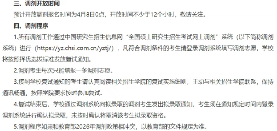 第一轮调剂系统开放时间为2026年4月8日0:00-12:00,视生源情况,我校将另行公布后续调剂系统开放时间。