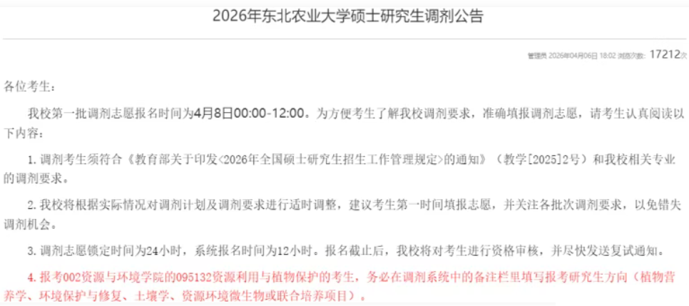 预计开放调剂报名时间为4月8日0点,开放时间不少于12个小时。