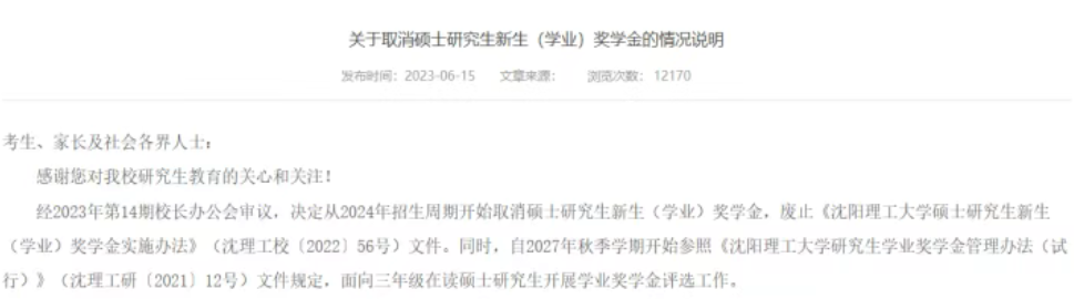 沈阳理工大学从2024年招生周期开始取消硕士研究生新生(学业)奖学金。