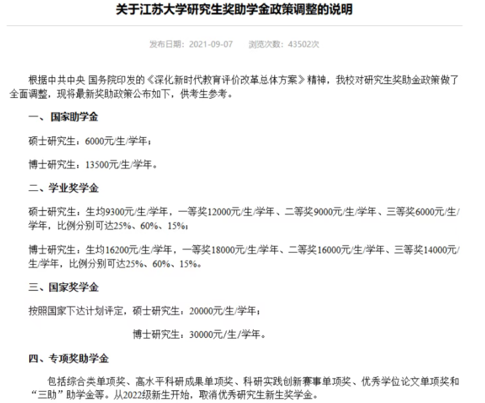 江苏大学从2022级新生开始,取消优秀研究生新生奖学金。