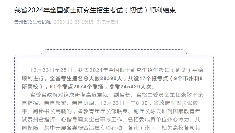 根据贵州省教育考试院发布的《我省2024年全国硕士研究生招生考试(初试)顺利结束》简章,我们了解到该省2024年考研初试已经圆满结束。考生们可以期待在2024年2月26日之后查询自己的初试成绩。