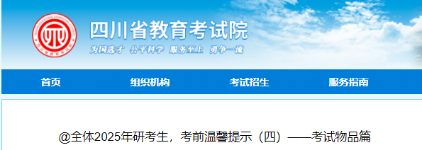 2024年12月16日,四川省教育考试院发布《@全体2025年研考生,考前温馨提示(四)——考试物品篇》,小编将详情整理如下,请参阅。