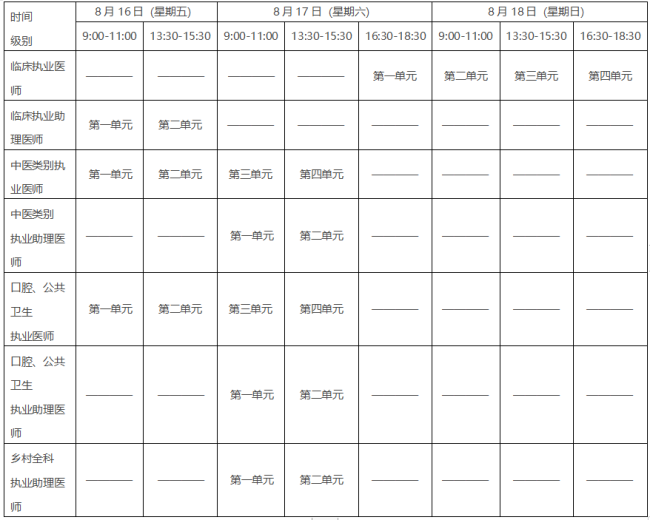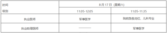 考试实行计算机化考试,军队现役人员加试军事医学、院前急救岗位和儿科专业加试相应内容。统一考试时间如下: