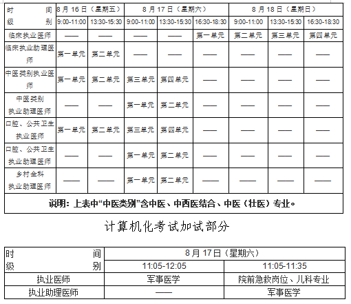 医学综合考试实行计算机化考试,军队现役人员加试军事医学、院前急救岗位和儿科专业加试相应内容。统一考试时间如下: