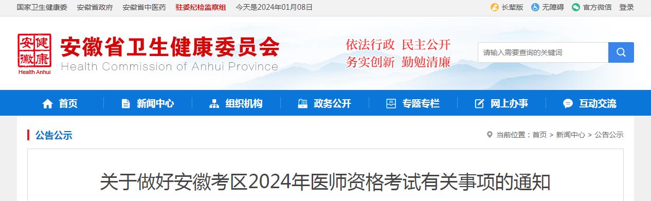 根据国家卫生健康委医师资格考试委员会公告(2023年第2号)要求,结合我省实际,现将安徽考区2024年医师资格考试有关事项通知如下: