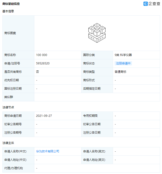 10 月 12 日消息 信息显示,近日,华为技术有限公司申请注册 100 000 图形商标,该商标国际分类涉 9 类科学仪器,目前商标状态为注册申请中。