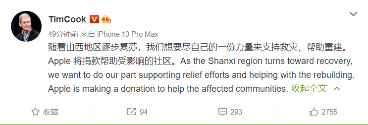 库克也附上了英文:As the Shanxi region turns toward recovery, we want to do our part supporting relief efforts and helping with the rebuilding. Apple is making a donation to help the affected communities.