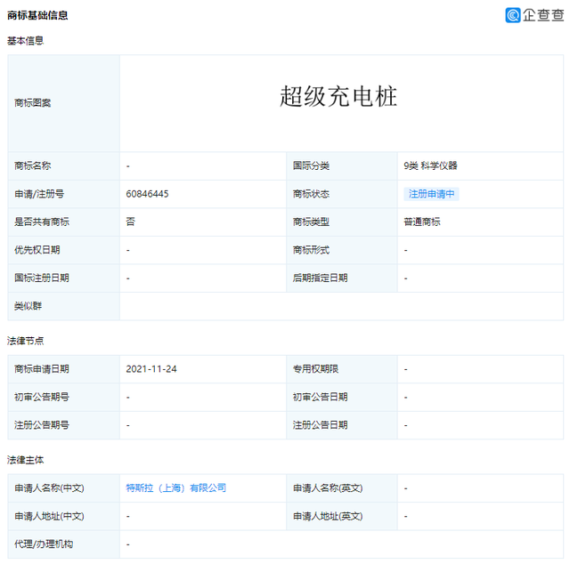 11 月 30 日消息,特斯拉(上海)有限公司近日申请“特斯拉超级充电桩”“超级充电站”“超充”等商标。