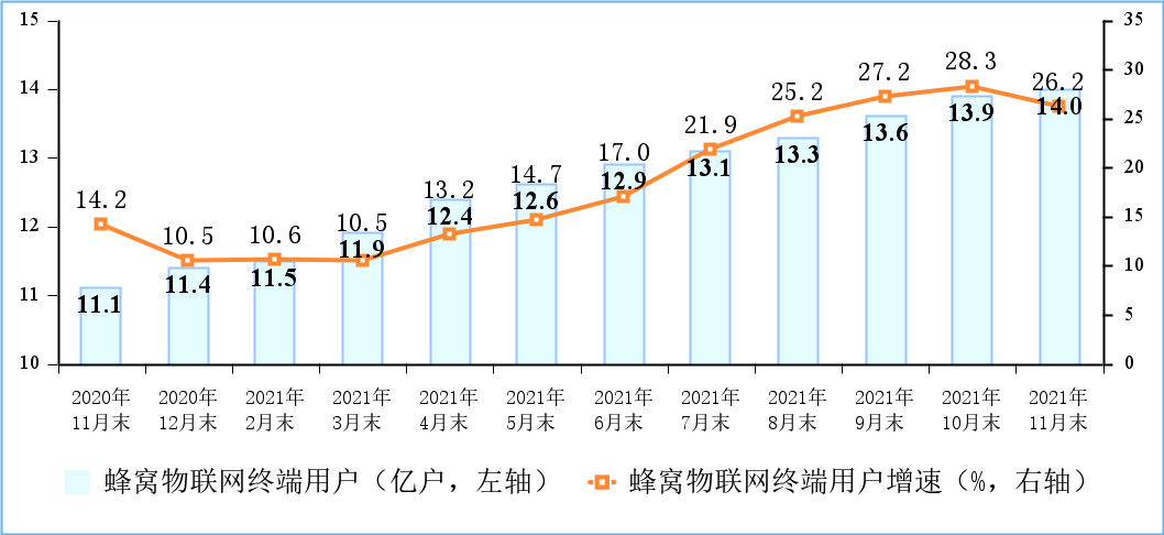 2020-2021年11月份末物联网终端用户情况。图片来源:工业和信息化部官网