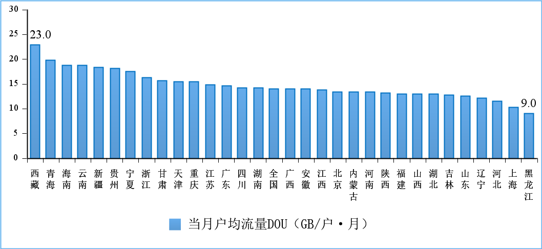 分地域来看,全国移动互联网接入流量均实现快速增长,中部地区增速领先。1-11月份,东、中、西部和东北地区移动互联网接入流量分别达到858亿GB、447亿GB、593亿GB和109亿GB,同比增长36%、38%、30.2%和30.2%。西藏和青海11月份当月户均移动互联网接入流量(DOU)超过19GB/户·月;各省DOU值最高值与最低值之差为14GB/户·月,差值较去年同期扩大3GB/户·月。