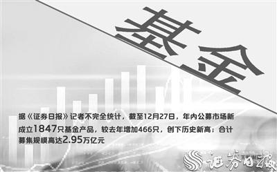 据《证券日报》记者梳理发现,截至12月27日,年内公募市场新成立1847只基金产品,较去年增加466只,创下历史新高;合计募集规模高达2.95万亿元,较去年募集总规模仅差1727亿元。