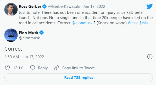 马斯克在 Twitter 上回应了特斯拉股东罗斯・盖博(Ross Gerber),他证实特斯拉认为在项目启动一年多之后,FSD Beta 没有出现任何一次事故。