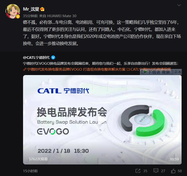 今日早间,蔚来副总裁沈斐在微博转发了宁德时代的发布会,并表示宁德时代是蔚来 2020 年成立电池资产公司的合作伙伴,现在亲自下场换电,会进一步推动换电发展。
