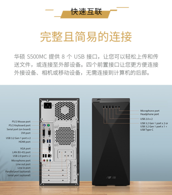 真正的办公利器,定会考虑用户在不同场景下的使用需求。为了解决用户在拷取文件和拓展外设的接口冲突;避免频繁进行无效的肢体动作,影响办公效率,华硕碉堡M5在硬件扩展方面,为用户准备了丰富且完备的接口。前置四个USB接口,方便用户随时将移动存储设备插入其中;并进行文件的读取和保存,而后置的四个USB接口则可以插入用户常用的外接设备;不用再忍受工位前线多线乱的困扰。同时主机背部所配备的HDMI、VGA接口,让用户可将设备连接显示器,电视机,投影仪等显示设备,满足会议投屏,双开屏幕等办公需求。