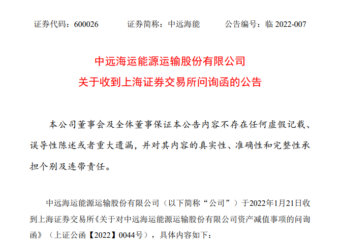 中远海能是1月21日披露计提减值金额最高的公司。2021年末,中远海能对现有141艘船舶中的94艘船舶资产计提减值准备,合计约49.6亿元。