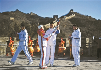 今天,经过约1200名火炬手传递的北京冬奥会火炬,将点燃国家体育场主火炬塔。图为火炬手吴静钰与护卫队员在八达岭西平台点火。