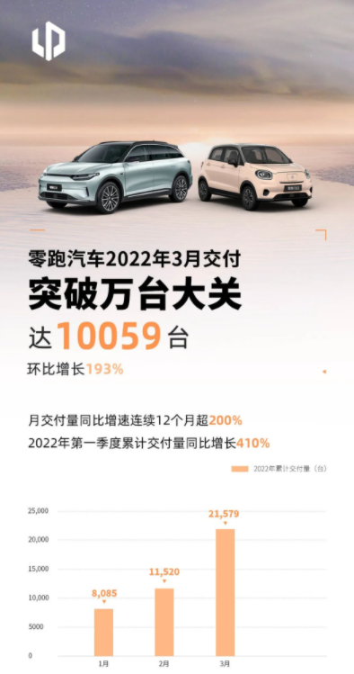 4 月 1 日消息,四月第一天,各大车企开始公布自家最新成绩,零跑汽 3 月交付超万台大关,达 10059 台,环比增长 193%,月交付量同比增速连续 12 个月超 200%,2022 年第一季度累计交付量同比增长 410%。
